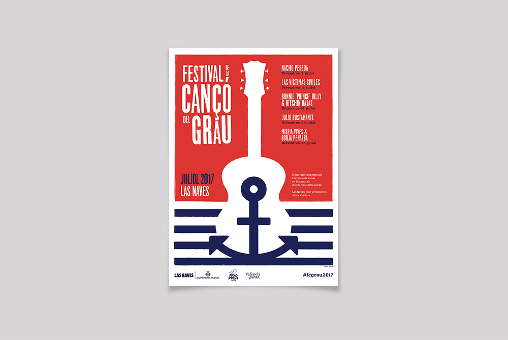 El Festival de la Cançó del Grau reivindica los conciertos al aire libre, los distritos marítimos de Valencia y el verano. Esta serie de conciertos se celebró durante el mes de julio de 2017 en la terraza de Las Naves y nos encargamos del desarrollo de la imagen gráfica, cartelería y diferentes aplicaciones tanto impresas como destinadas a las redes sociales.